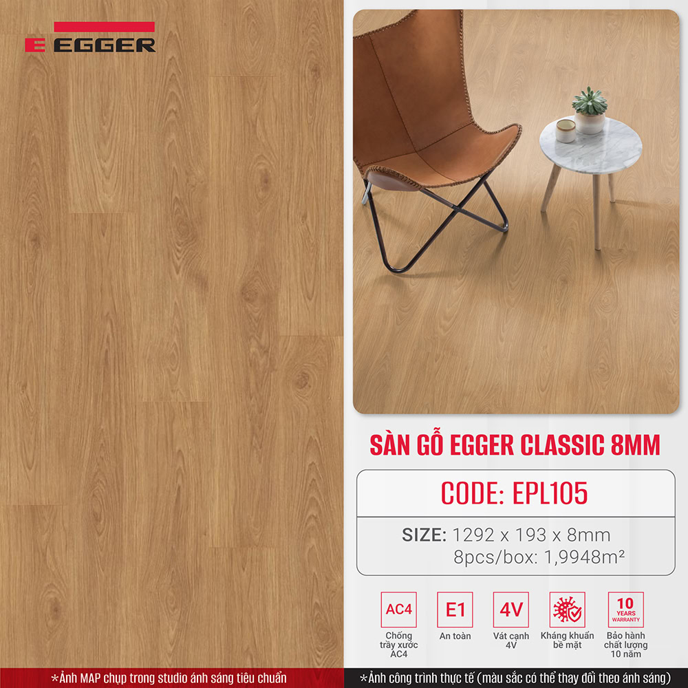 Specifications Egger Classic 8mm EPL105 laminate flooring is not low profile. With AC4 scratch resistance, Class 32 usage limit, the floor can be used in high-density buildings such as offices, libraries, etc.