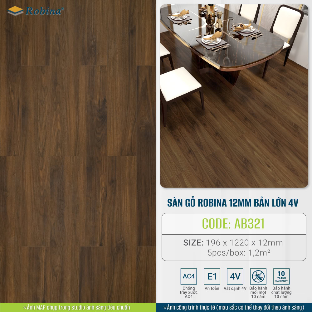 Robina 12mm large-size laminate flooring AB321 (Caramelo Walnut) is a product Official import from Malaysia and okay 10 year termite warrantyThis is a reliable choice for homeowners who want a product that is durable, luxurious, and safe for the typical hot and humid climate.
