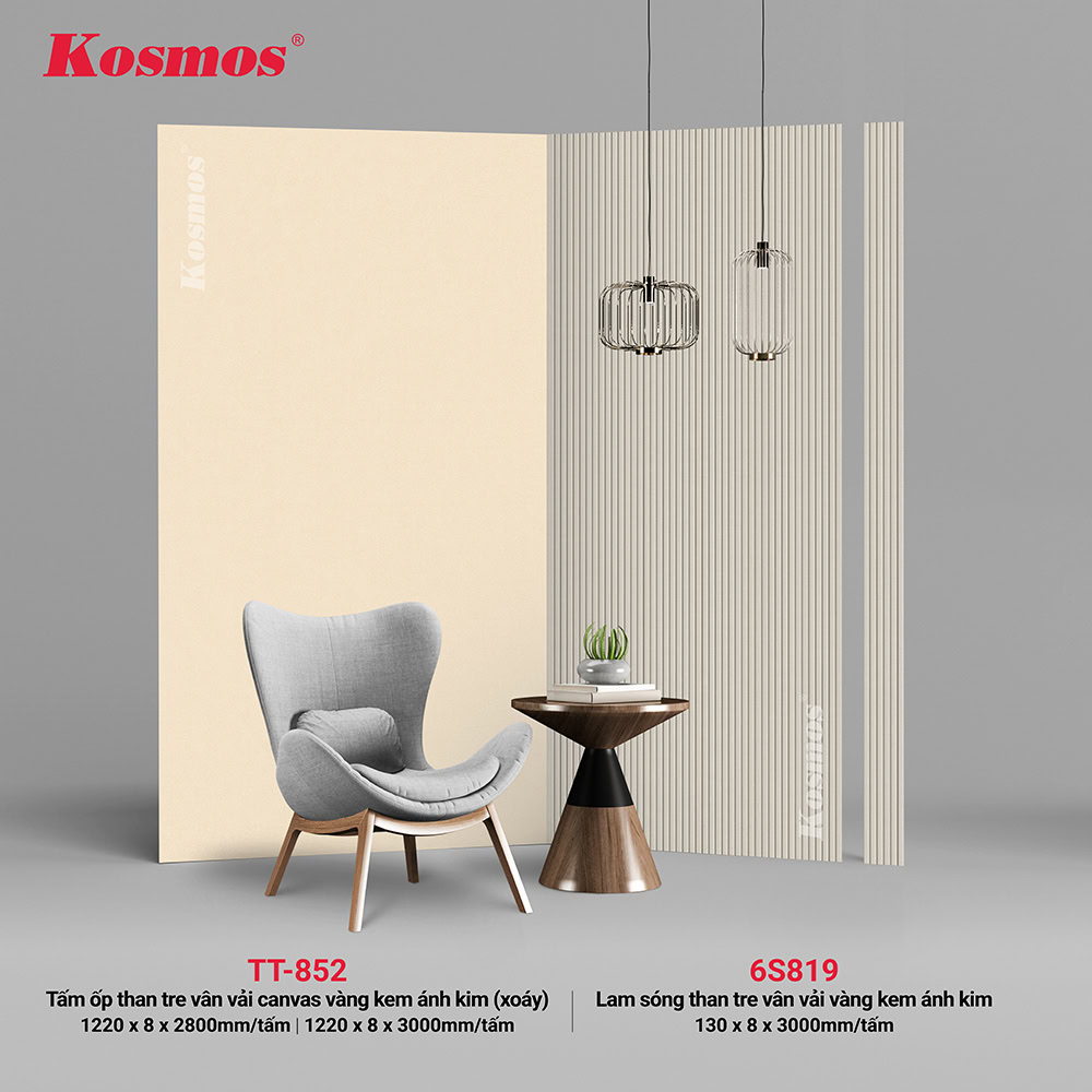 Product sets Fluted panel bamboo charcoal 6S819 metallic cream gold fabric grain combined with TT-852 bamboo charcoal panel, metallic cream gold canvas with swirl pattern is a suitable choice for projects that require both accents and a flat background with soft pattern details. The uniformity of color combined with the difference in shape and pattern helps the project achieve balance, easy to apply in many design styles.