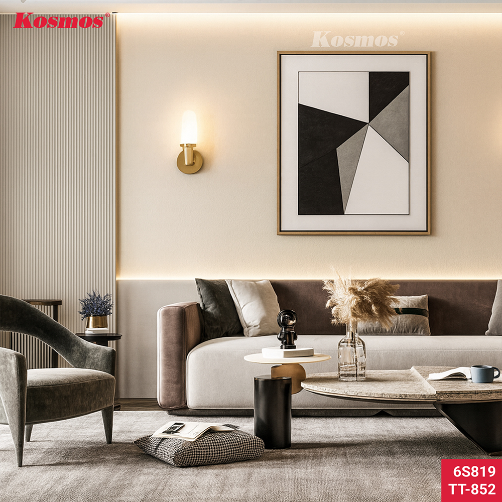 In interior design, the combination of two different but similar-toned surfaces often brings a balanced effect. When combined, the fluted panel 6S819 plays an emphatic role, TT-852 adds a flat background but still maintains delicate pattern details.